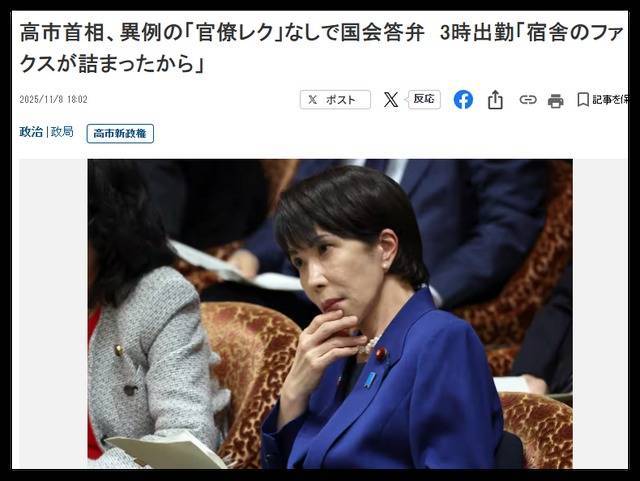 根据韩国《朝鲜日报》的报道,这件事发生在11月7日上周五,当天凌晨3时1分,高市早苗离开了她所居住的东京都赤坂议员宿舍,并于3时4分进入首相公邸,开始为当天上午9时日本国会众议院预算委员会的质询进行准备。她还为此把秘书官团队、安保人员和司机都喊了起来,其中秘书官还与她一起开了3个小时的会。