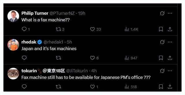 目前,她的这一解释也引起了不少争议,连一些外国人都觉得日本首相居然还在用传真机接收信息很魔幻。新西兰驻韩国前大使菲利普·特纳就在社交媒体上调侃说:“啥是传真机啊?”